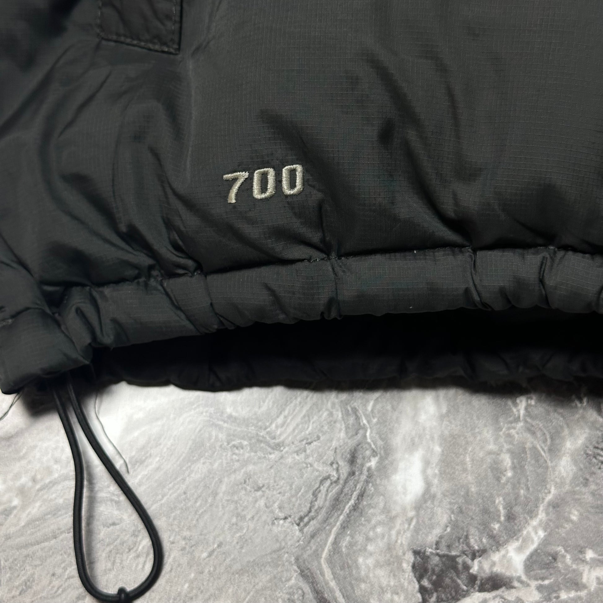 Schwarze, ärmellose Daunenweste von The North Face mit 700er Füllkraft und gesticktem Logo auf Brust und Rücken. Ein ikonischer Outdoor-Style, perfekt zum Kombinieren für einen sportlichen, Outdoor- oder Streetwear-Look.