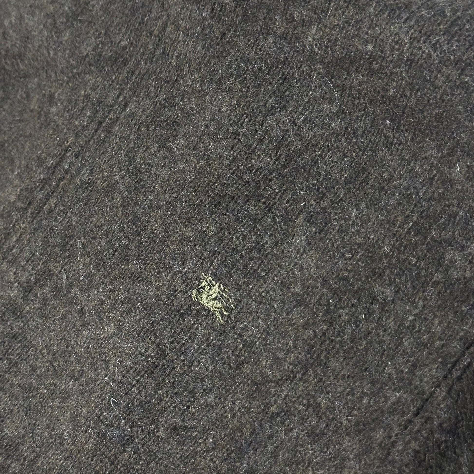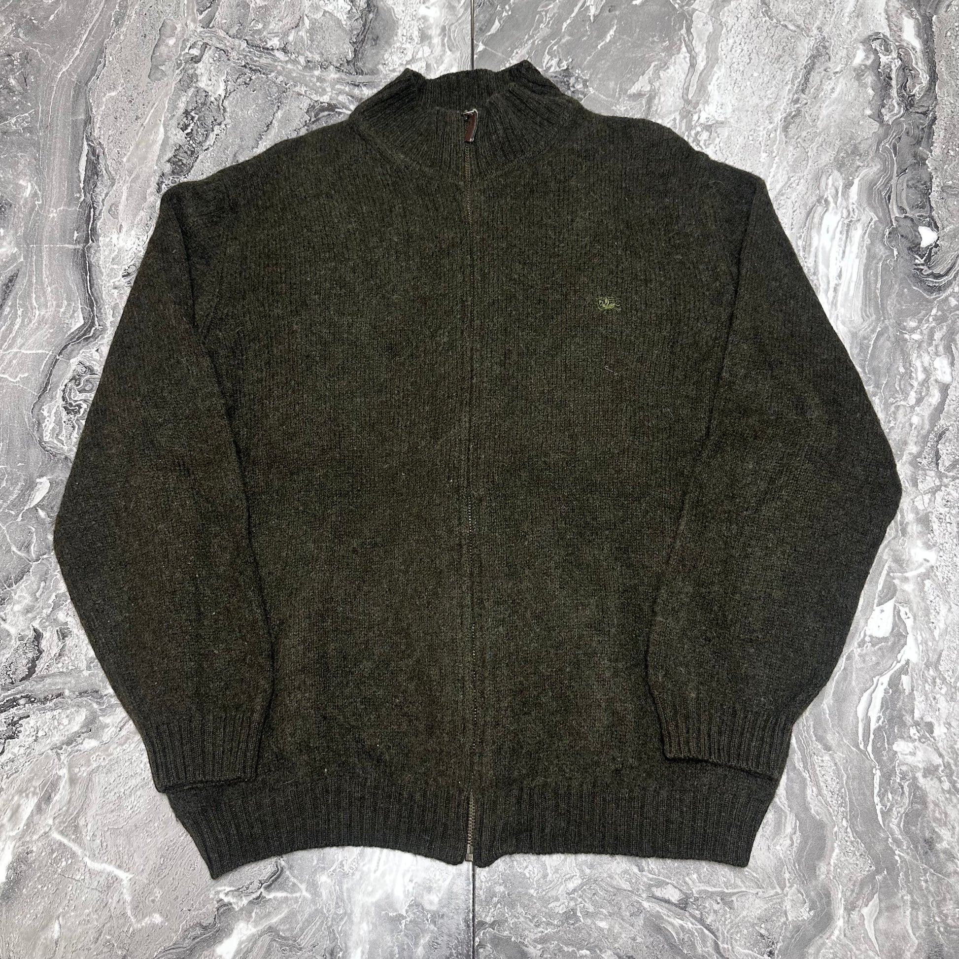 Burberry Strickjacke aus melierter, khakigrüner Wolle mit Reißverschluss und Ton-in-Ton gesticktem Logo auf der Brust. Ein elegantes und zeitloses Kleidungsstück, ideal für einen stilvollen Casual-Chic-Look.