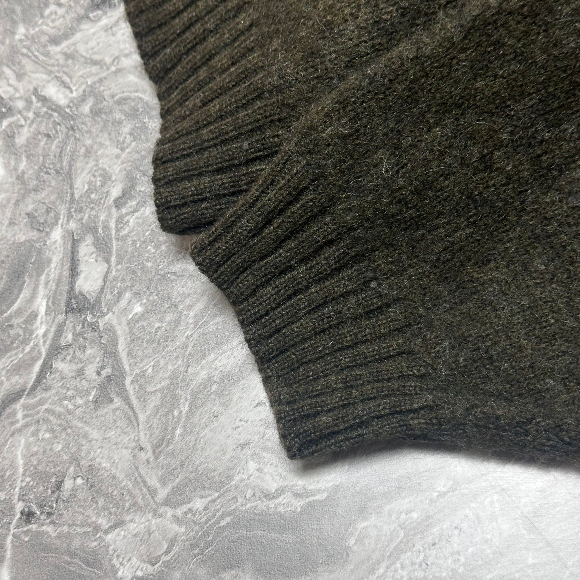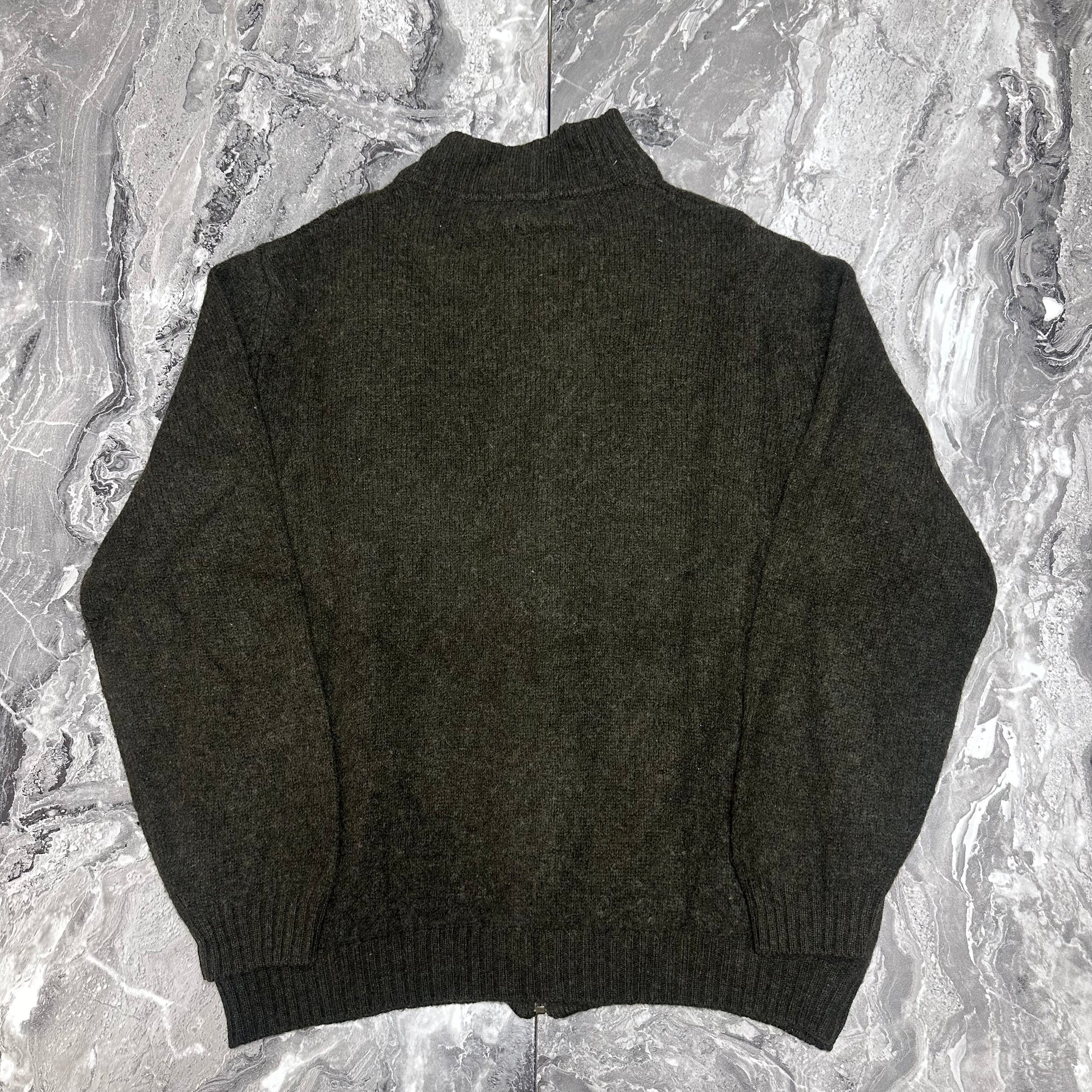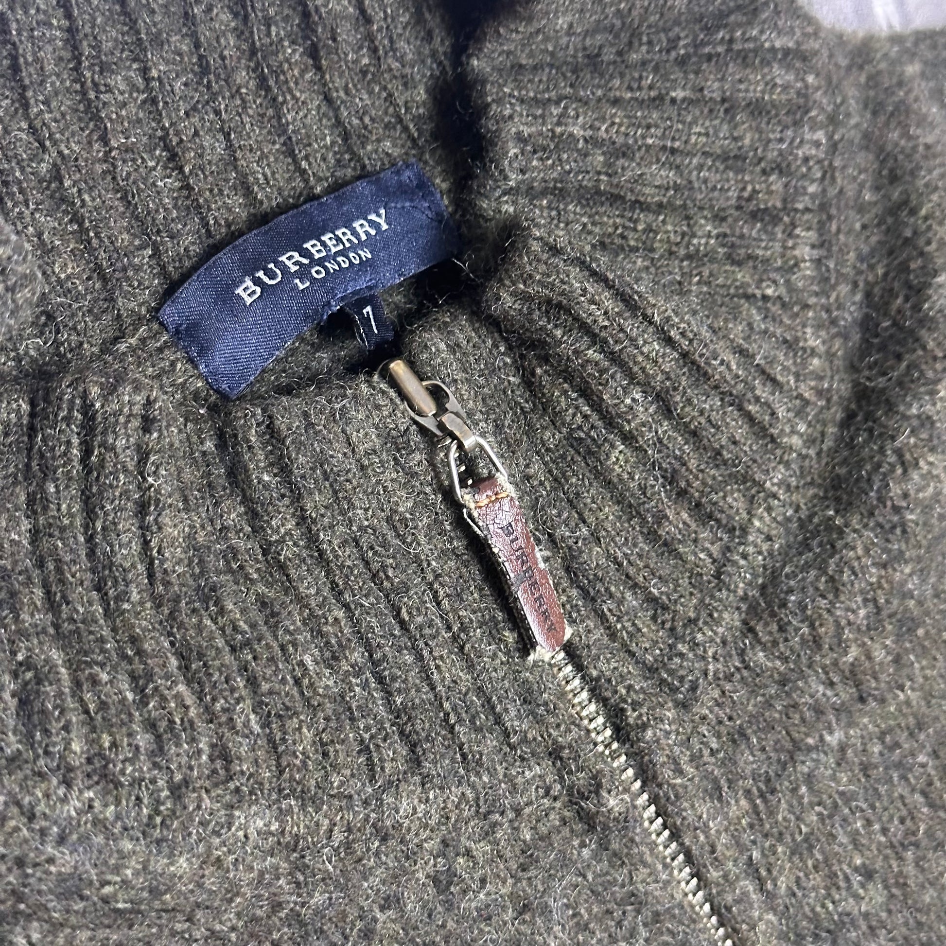 Diese Secondhand-Strickjacke besticht durch ihr grob geripptes Strickmuster, den Stehkragen und den mittigen Reißverschluss. Der khakigrüne Farbton verleiht ihr Charakter und macht sie gleichzeitig vielseitig kombinierbar. Der gerade, bequeme Schnitt eignet sich perfekt, um sie offen über einem T-Shirt oder geschlossen unter einer Jacke zu tragen. Die 100%ige Wollzusammensetzung garantiert Wärme und Qualität – ganz im Sinne der Burberry-Handwerkskunst. Dieses Kleidungsstück stammt aus unserer Secondhand-Kollektion und vereint klassischen Stil mit dem verantwortungsvollen Kauf von Gebrauchtwaren.