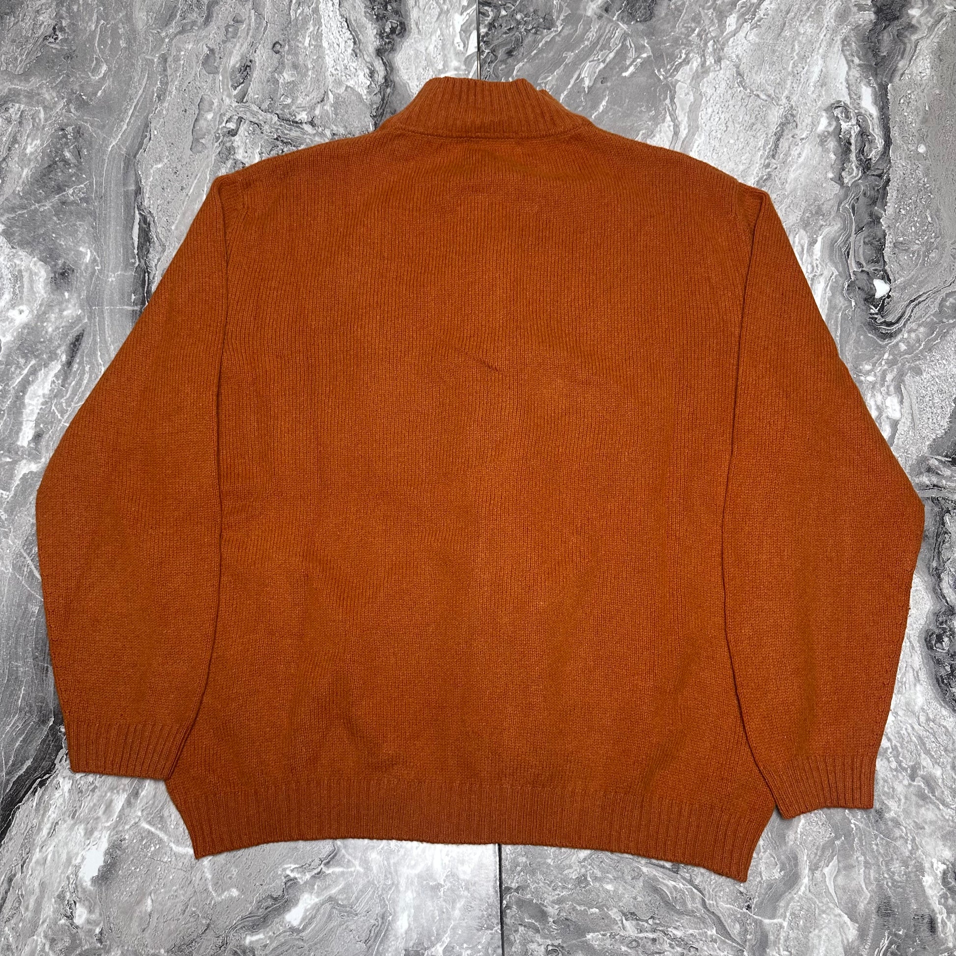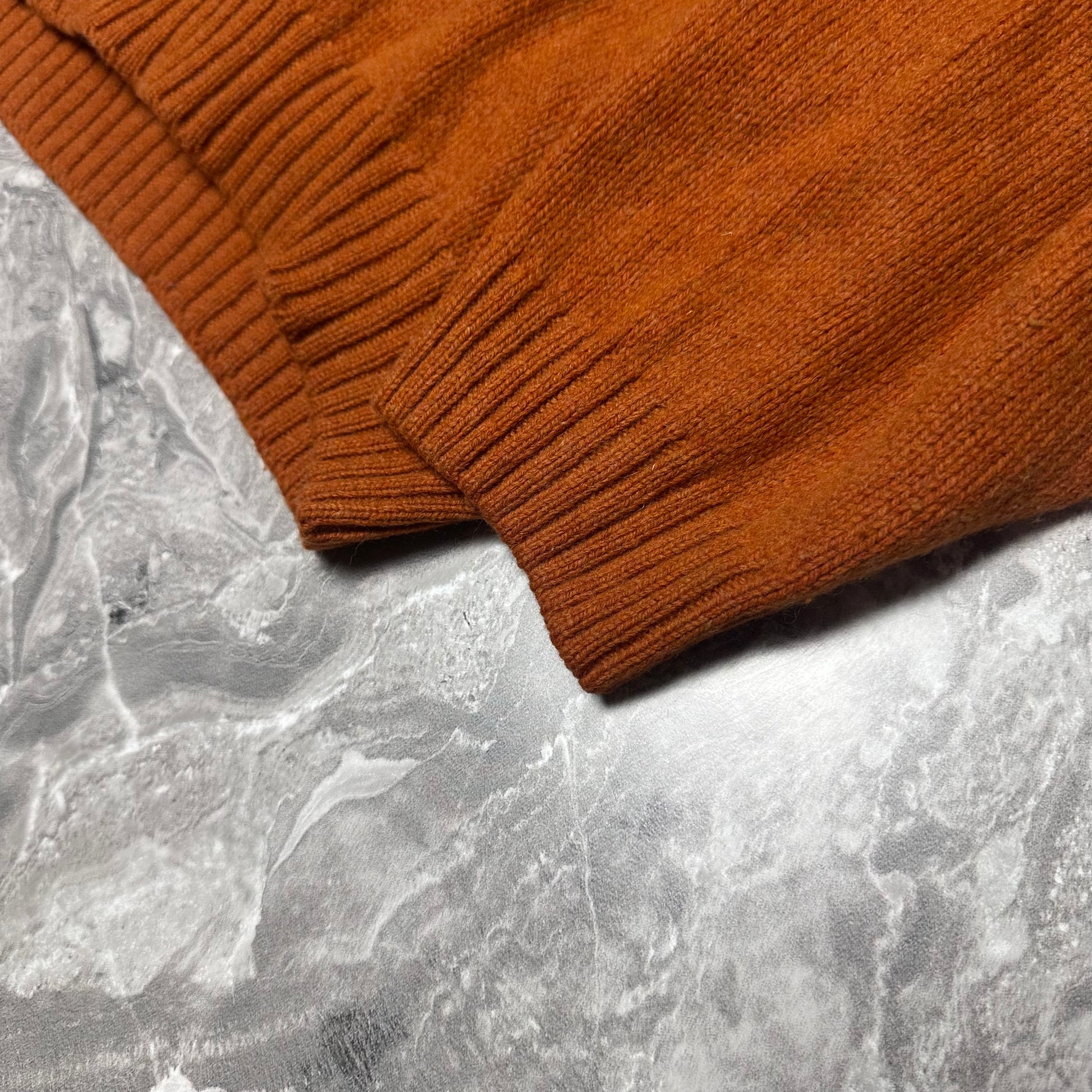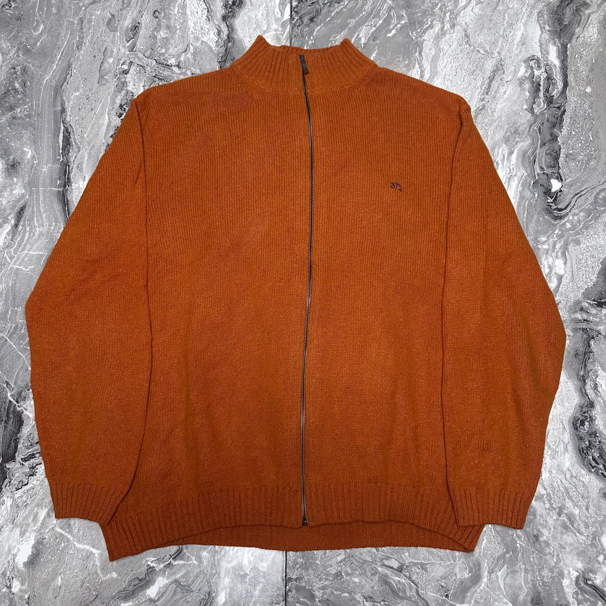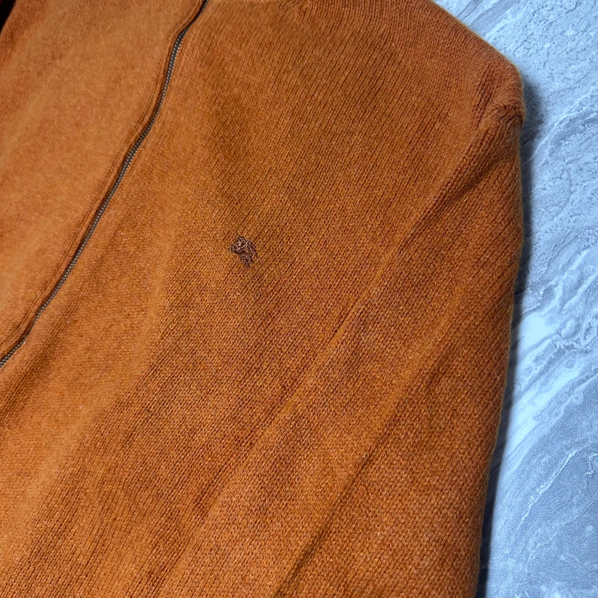 Cardigan von Burberry London in Rostorange mit durchgehendem Reißverschluss und Stehkragen. Ein elegantes und warmes Kleidungsstück, ideal für kühlere Jahreszeiten, mit bequemer Passform auch in großen Größen.