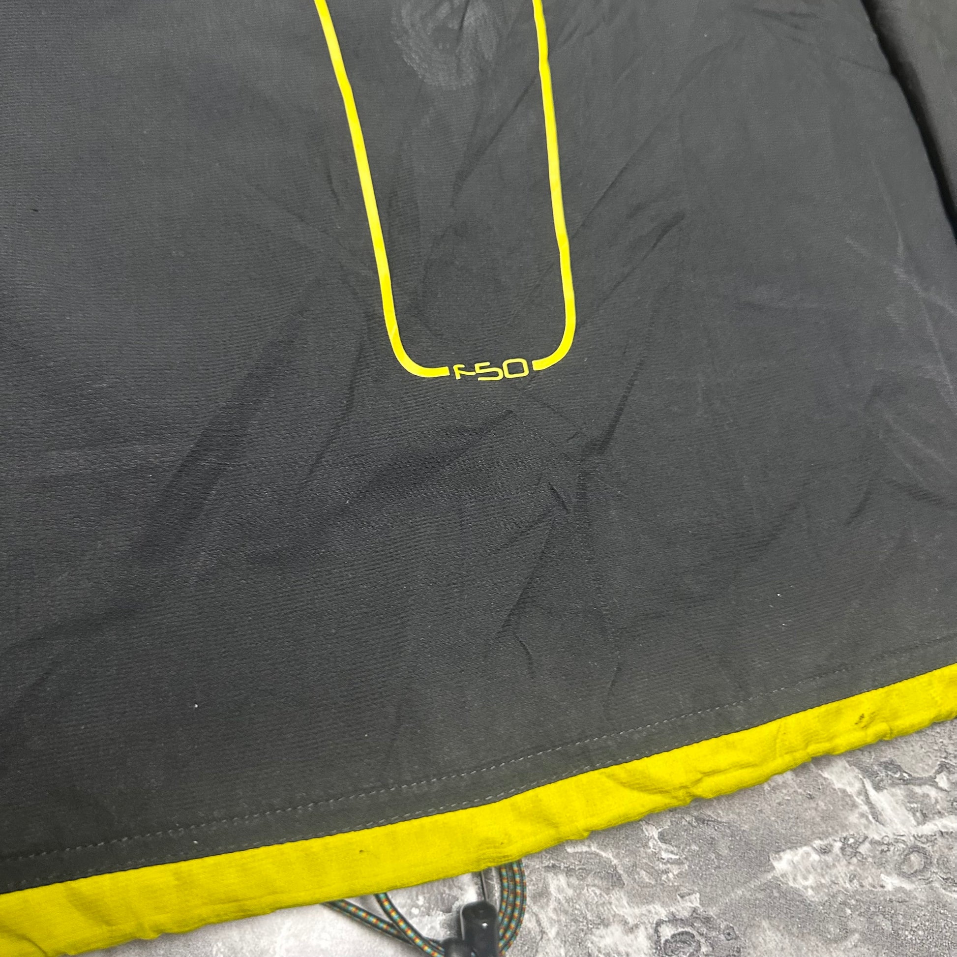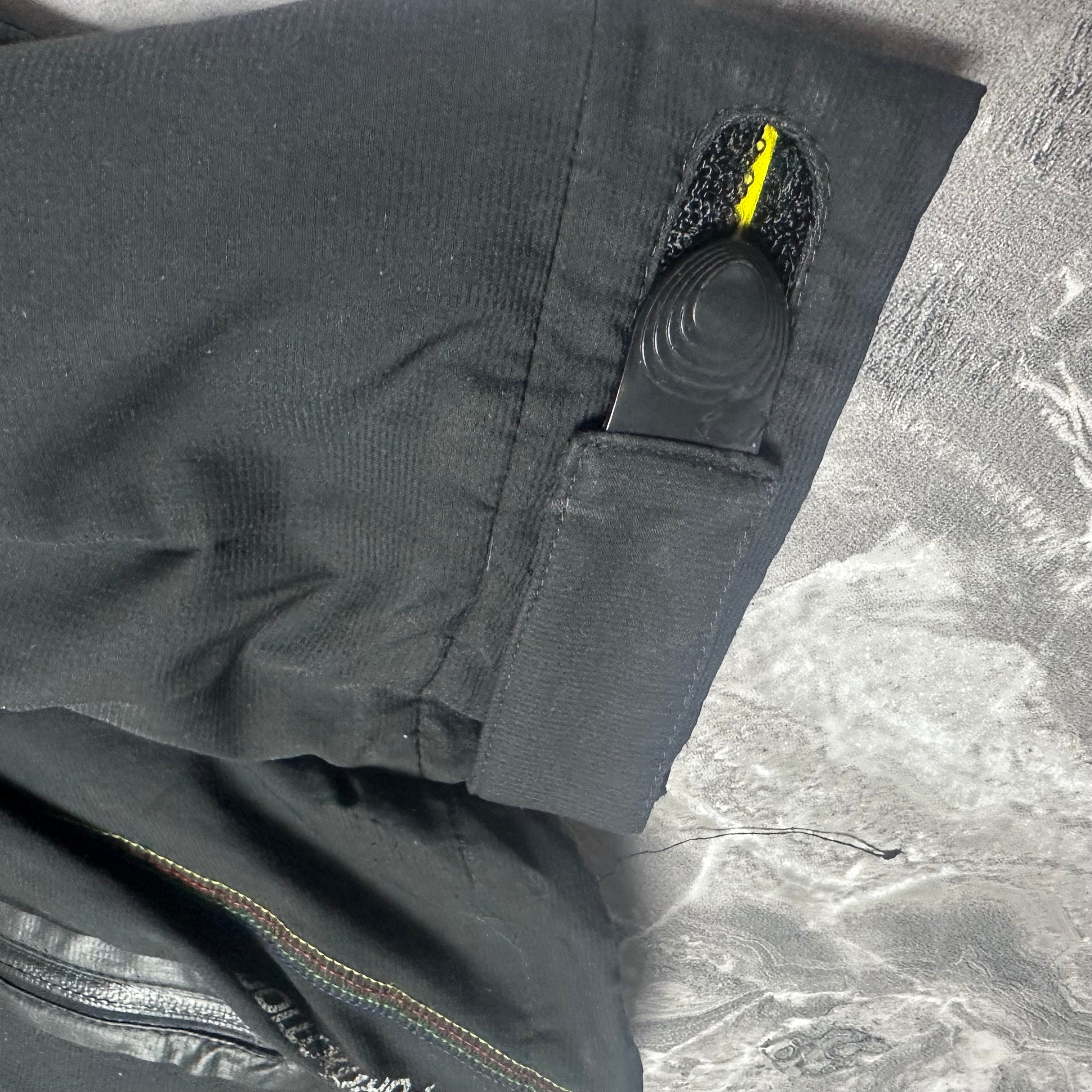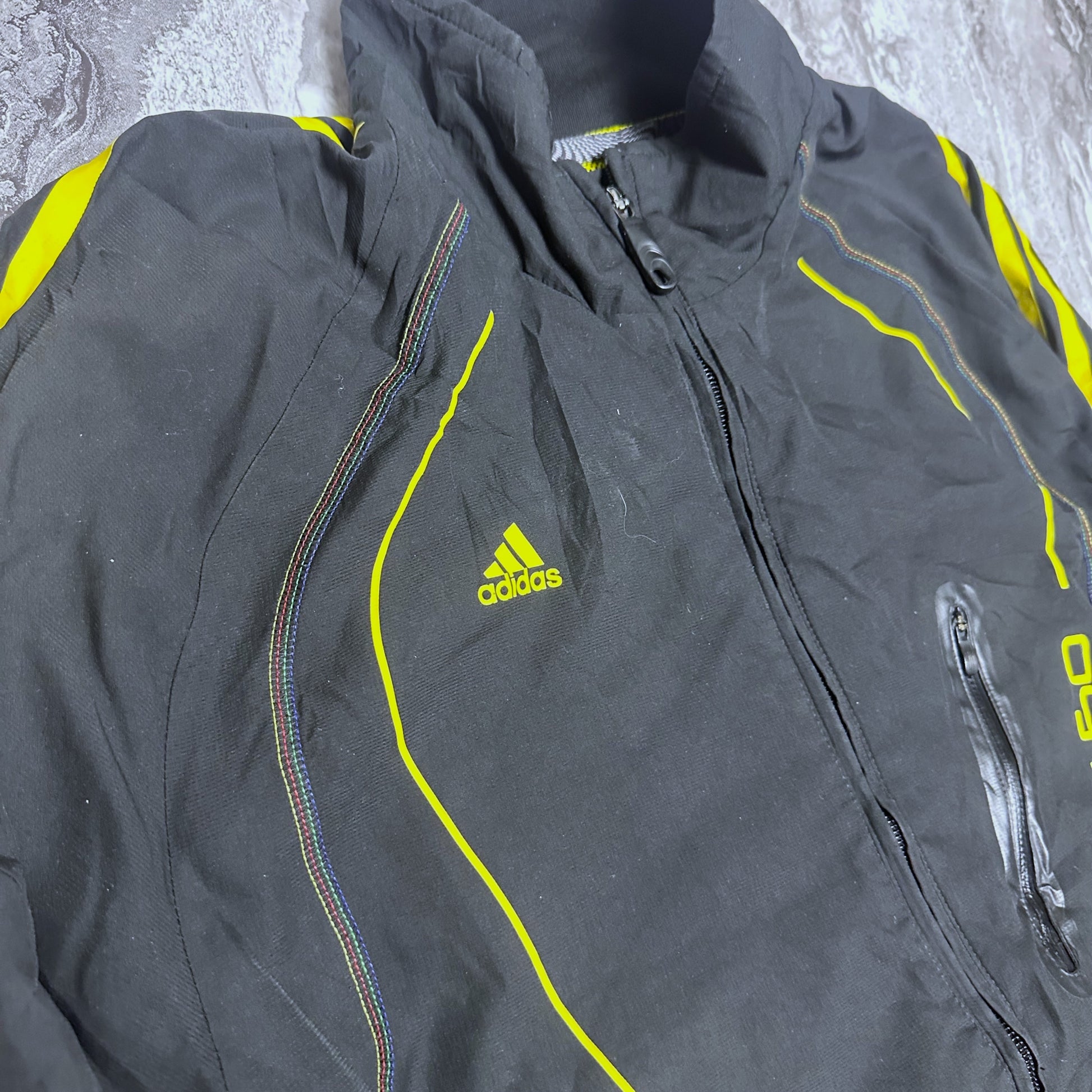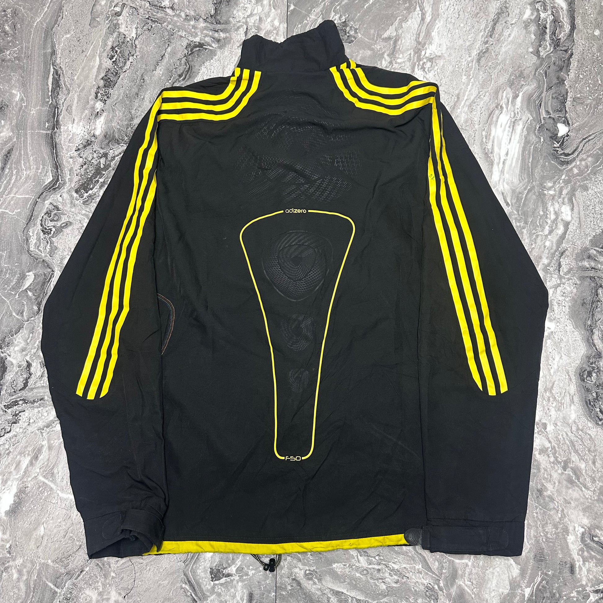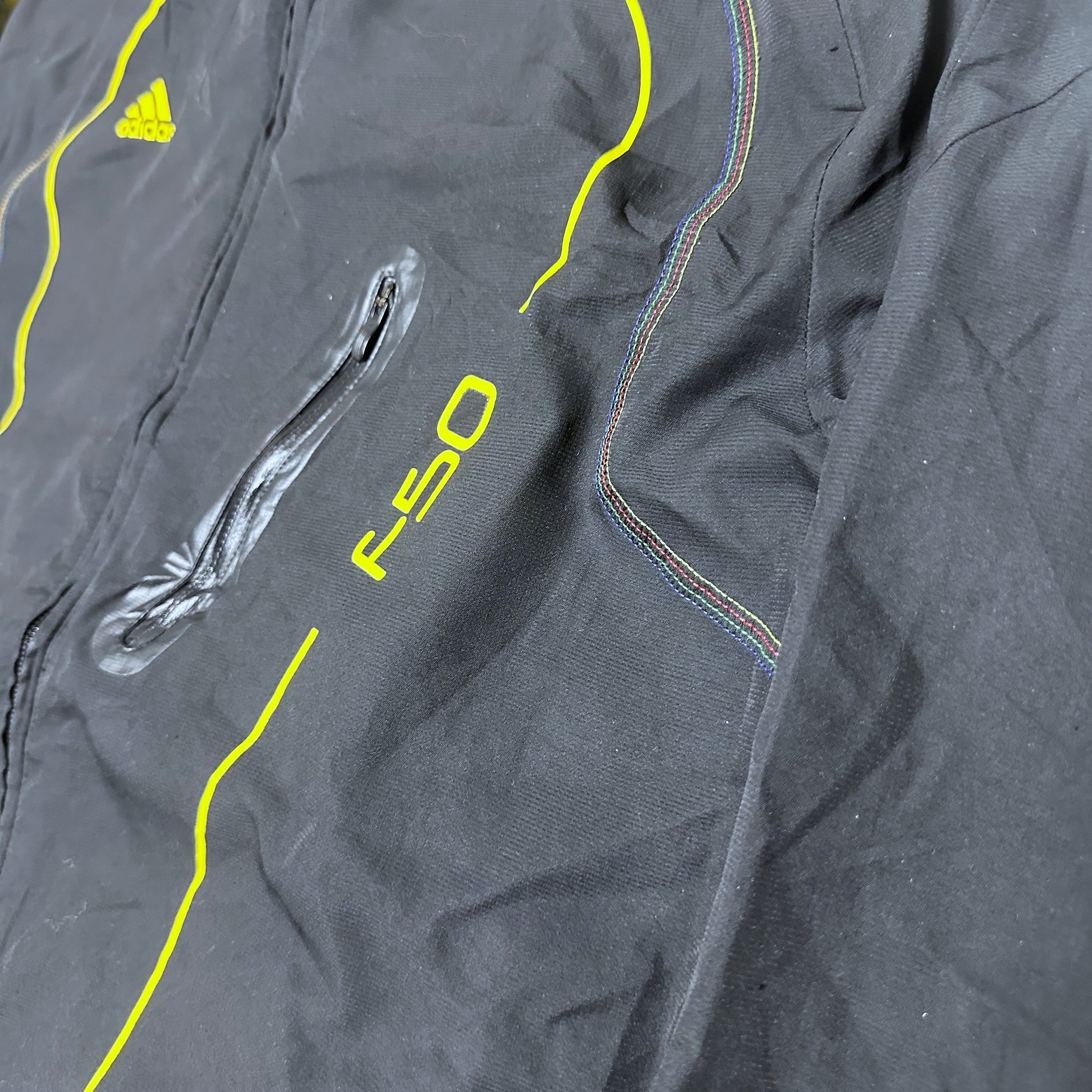 Schwarze Adidas Funktionsjacke mit neongelben Details aus der F50 Adizero Kollektion. Ein sportliches Modell mit dynamischem Design, ideal für einen lässigen Look im Stil der 2000er Jahre.