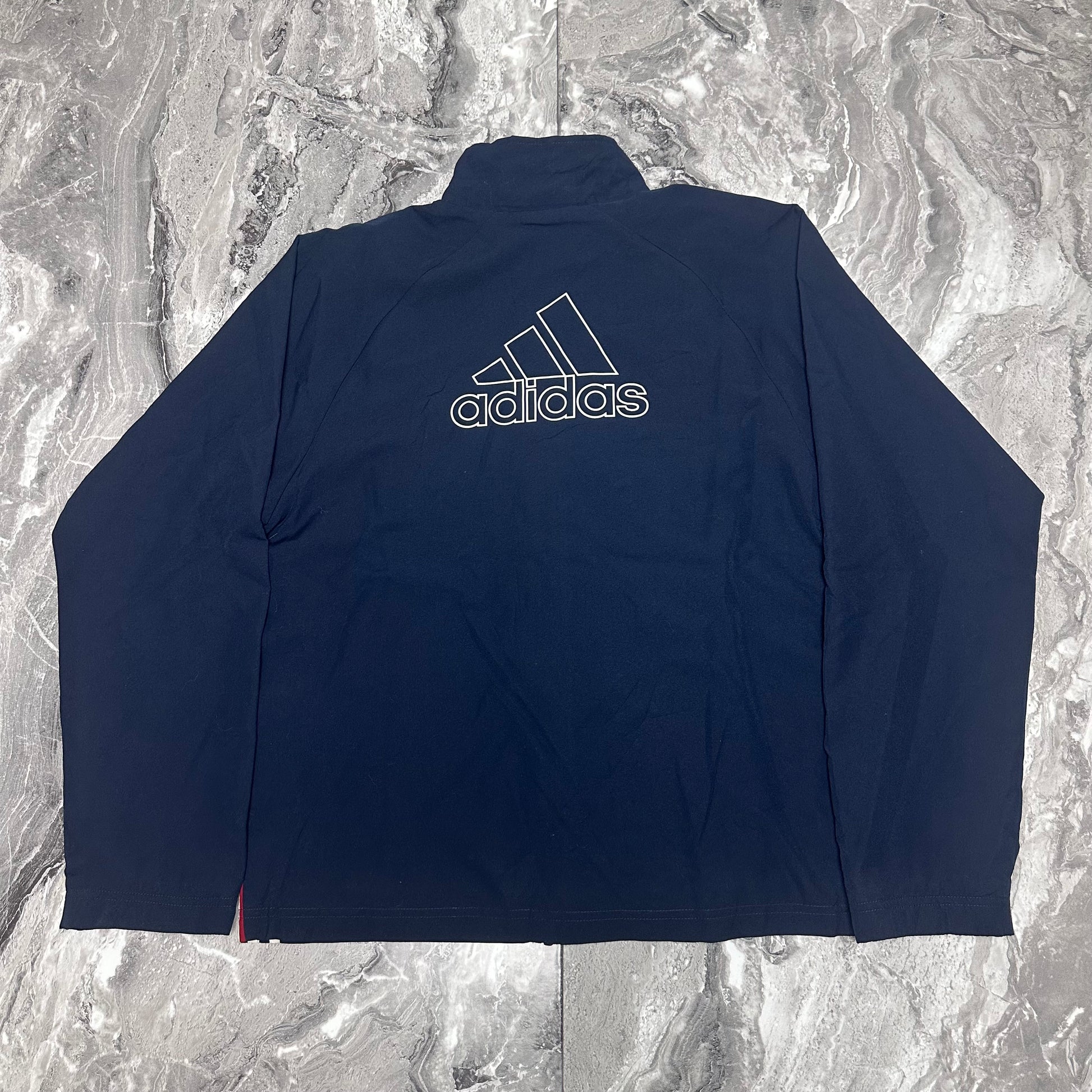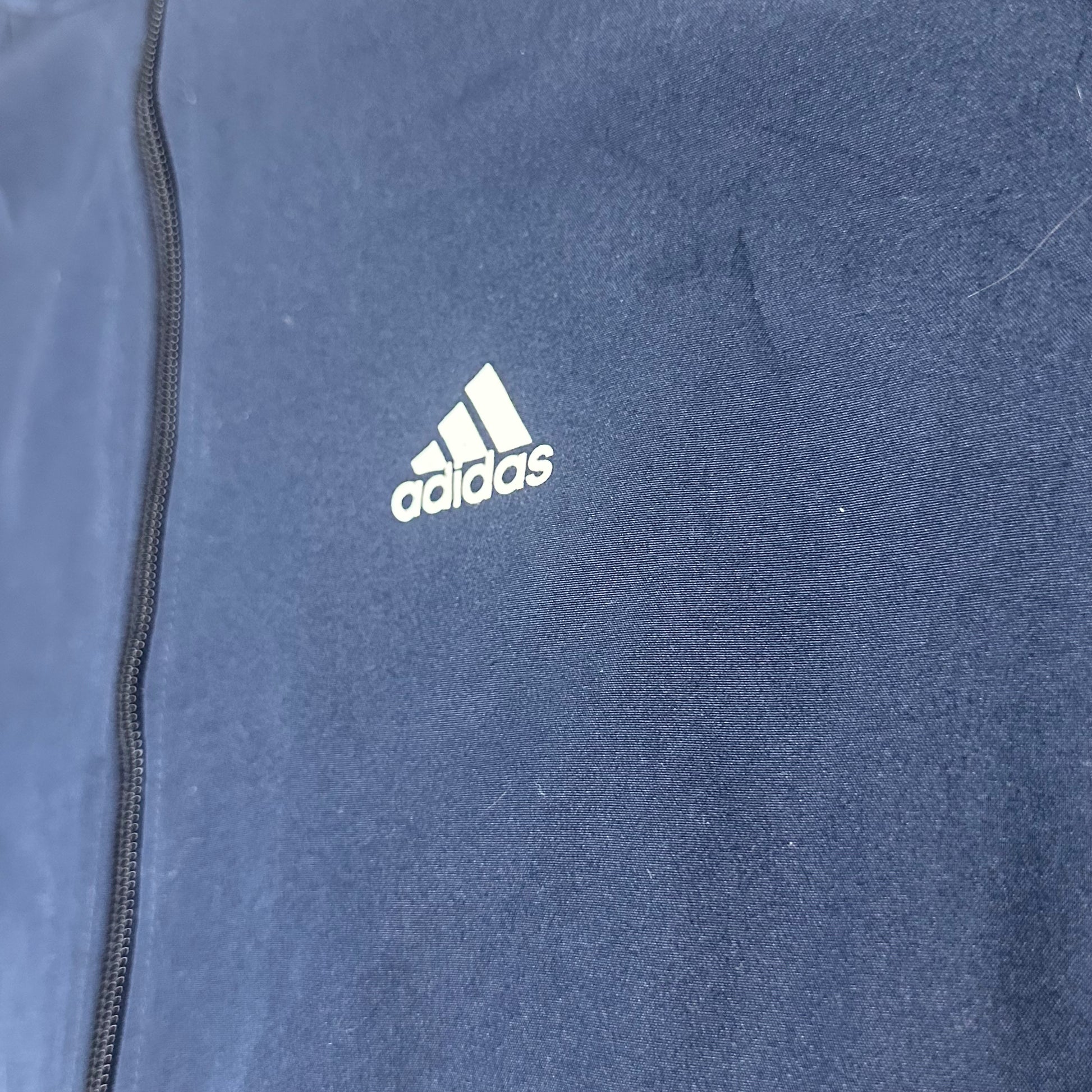 Marineblaue Adidas-Jacke im sportlich-zeitlosen Stil. Ein bequemes und vielseitiges Kleidungsstück, ideal für einen lässigen Alltagslook oder als Ergänzung zu einem Vintage-Outfit.