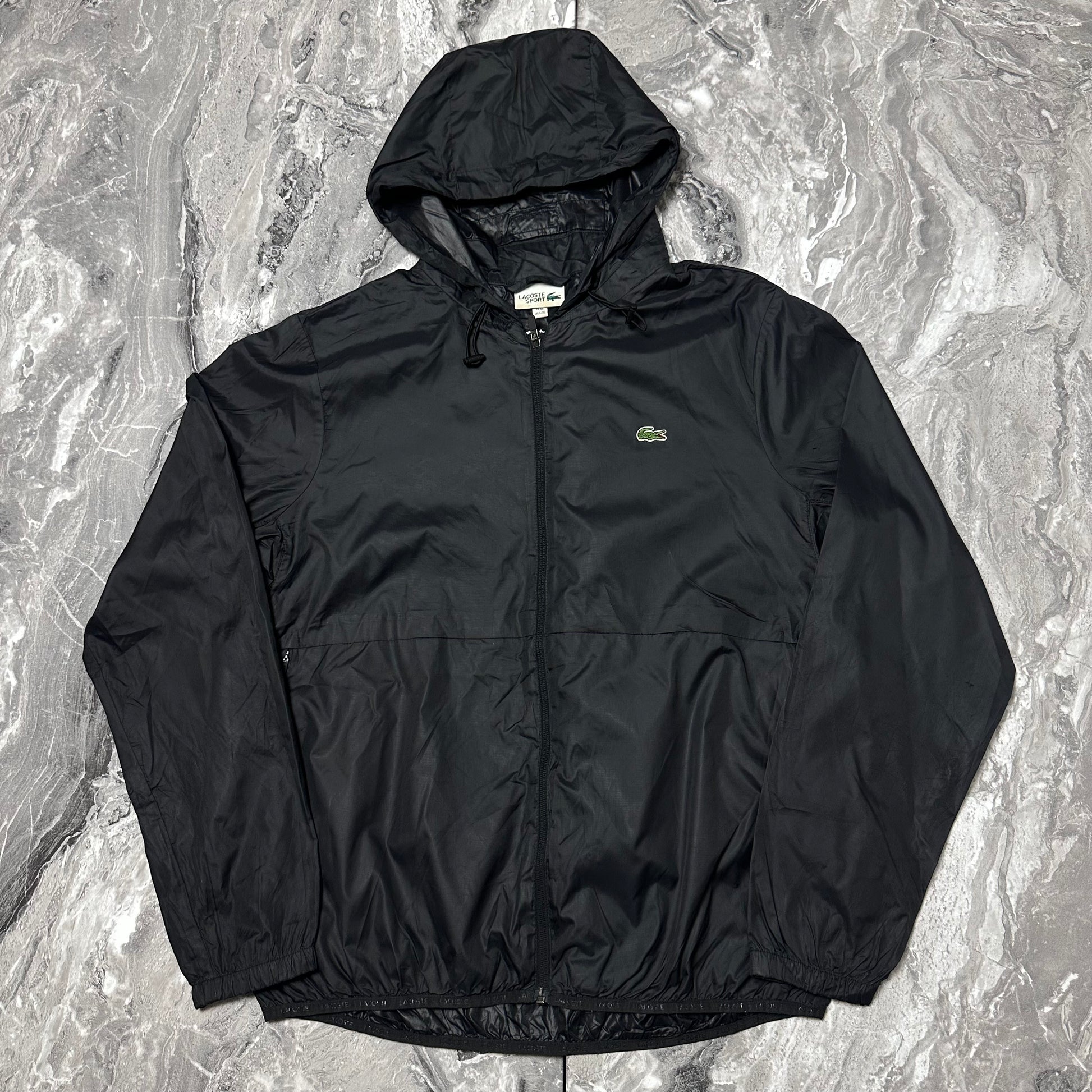 Schwarze Lacoste Sport Kapuzenjacke, leicht und vielseitig, perfekt für die Übergangszeit. Ein funktionales und zeitloses Kleidungsstück, erhältlich in unserem Secondhand-Shop.