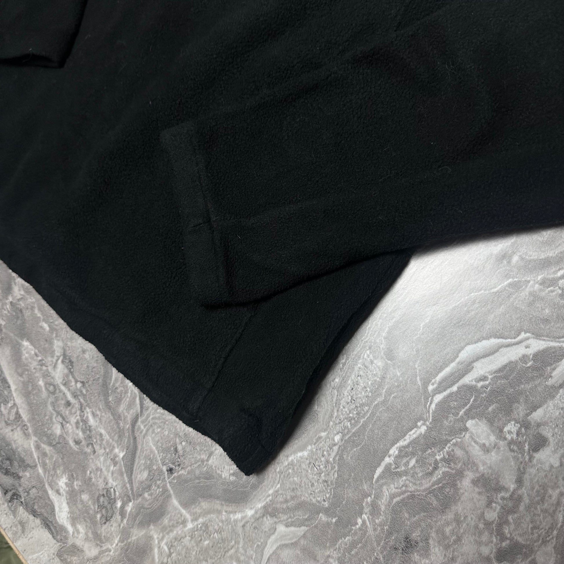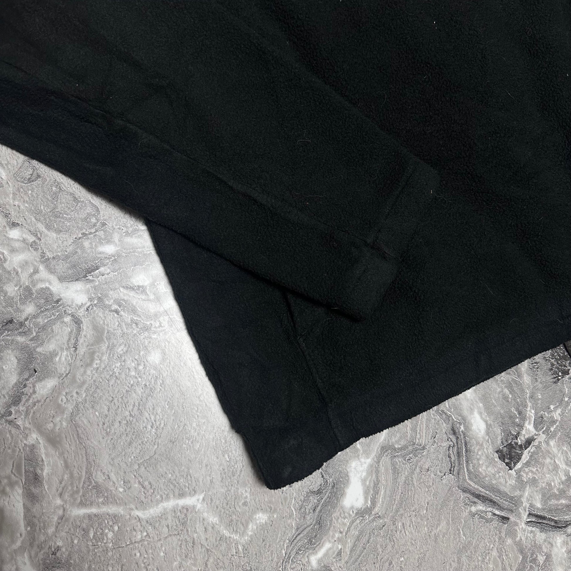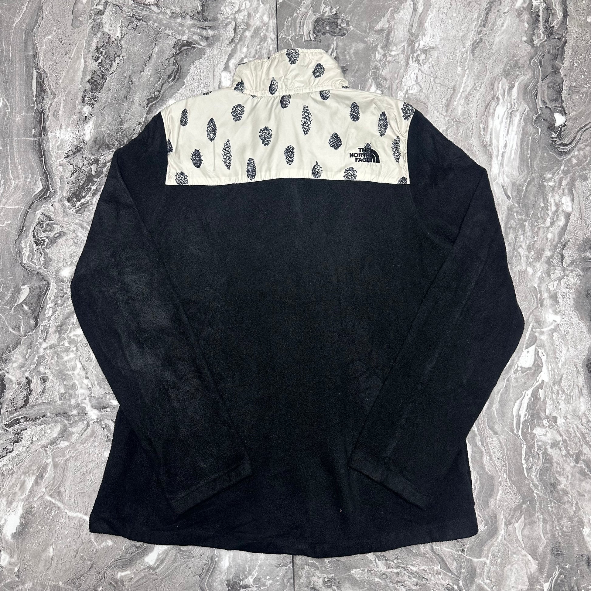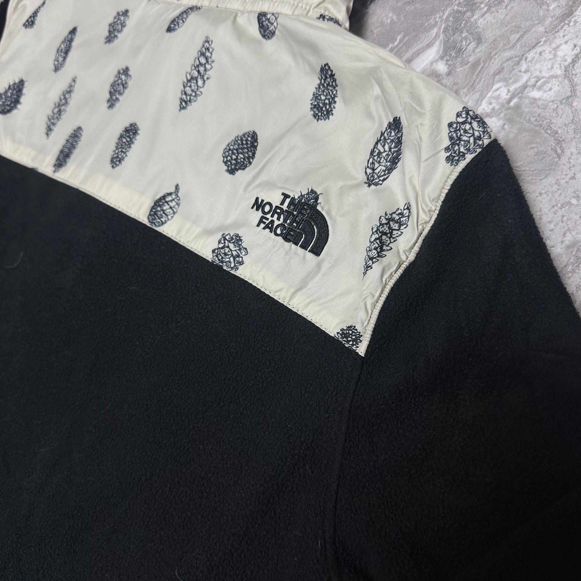 Schwarze Fleecejacke von The North Face mit cremefarbenem Einsatz im Tannenzapfenmuster und halbem Reißverschluss. Ein einzigartiges Outdoor-Kleidungsstück, das Komfort und Stil vereint.