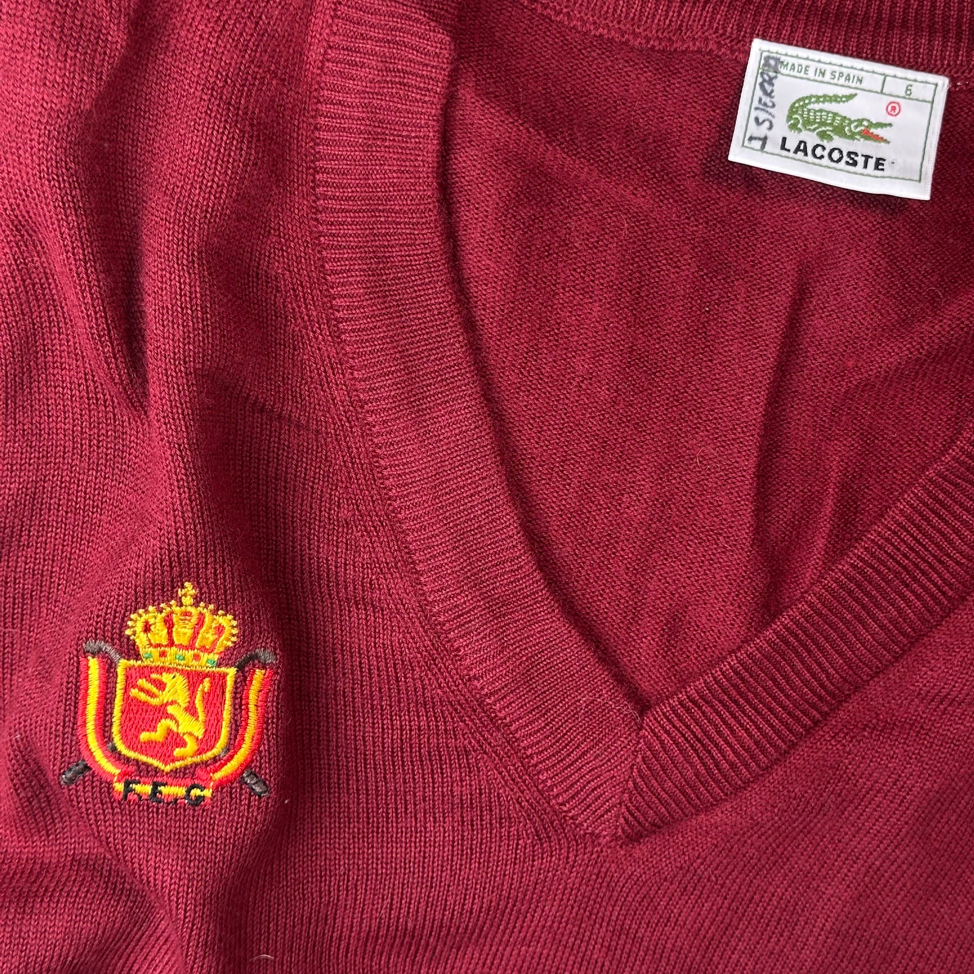 Ce pull sans manches Lacoste se distingue par sa maille fine de couleur bordeaux et sa coupe classique à col en V. Le célèbre crocodile brodé ainsi que l’écusson brodé sur la poitrine apportent une touche premium et distinctive, typique de l’univers Lacoste. Facile à porter sur une chemise ou un t-shirt, il s’intègre parfaitement dans un vestiaire casual ou vintage. En tant que pièce de seconde main soigneusement sélectionnée par notre friperie, ce vêtement offre une alternative durable et authentique, alliant qualité, style et histoire.