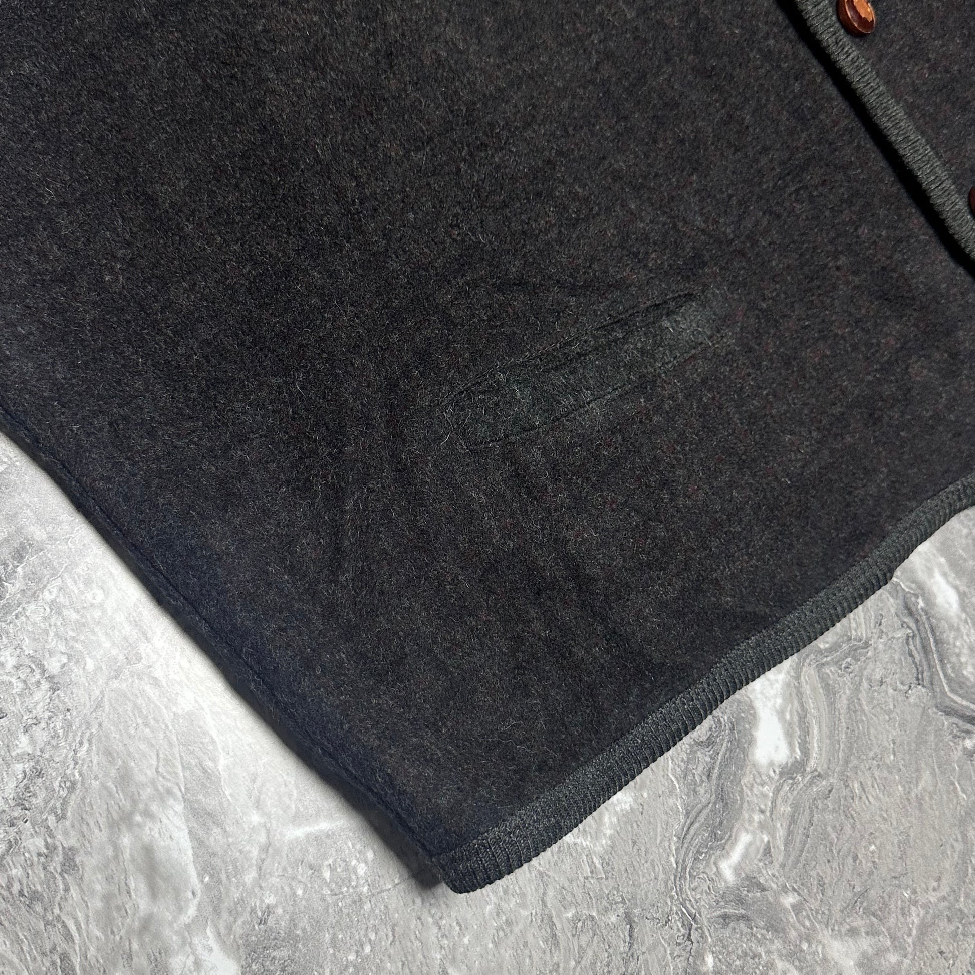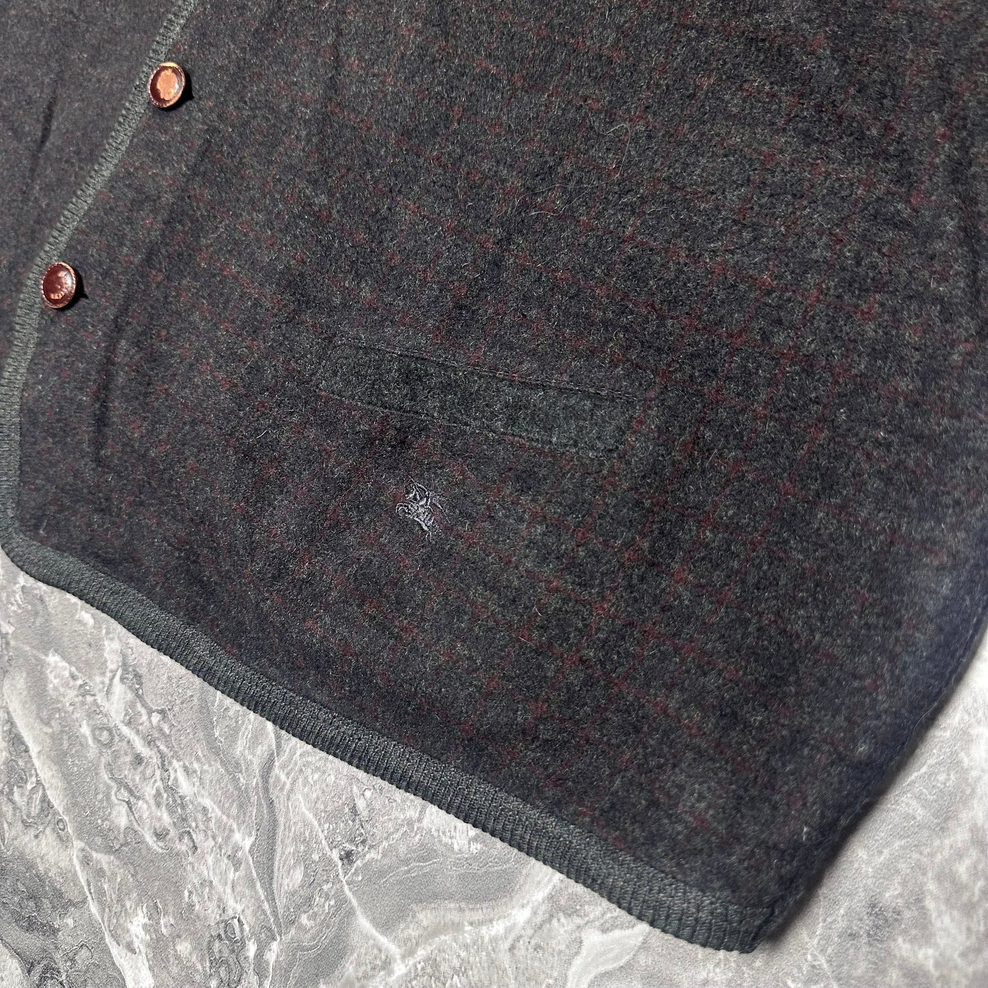 Ce gilet sans manches présente une coupe droite ample avec un col en V structuré et des boutons marron gravés qui renforcent son caractère authentique. La maille en laine affiche un motif quadrillé subtil dans des tons sombres, apportant profondeur et élégance à l’ensemble. Les bordures contrastées au col, aux emmanchures et à la base structurent la silhouette, tandis que les poches discrètes et le logo équestre brodé ajoutent une signature raffinée typique des anciennes collections Burberrys. Porté sur une chemise pour un style chic ou sur un pull fin pour un look plus casual, c’est une belle pièce de seconde main issue de notre friperie, parfaite pour les amateurs de vintage premium et de coupes plus généreuses.