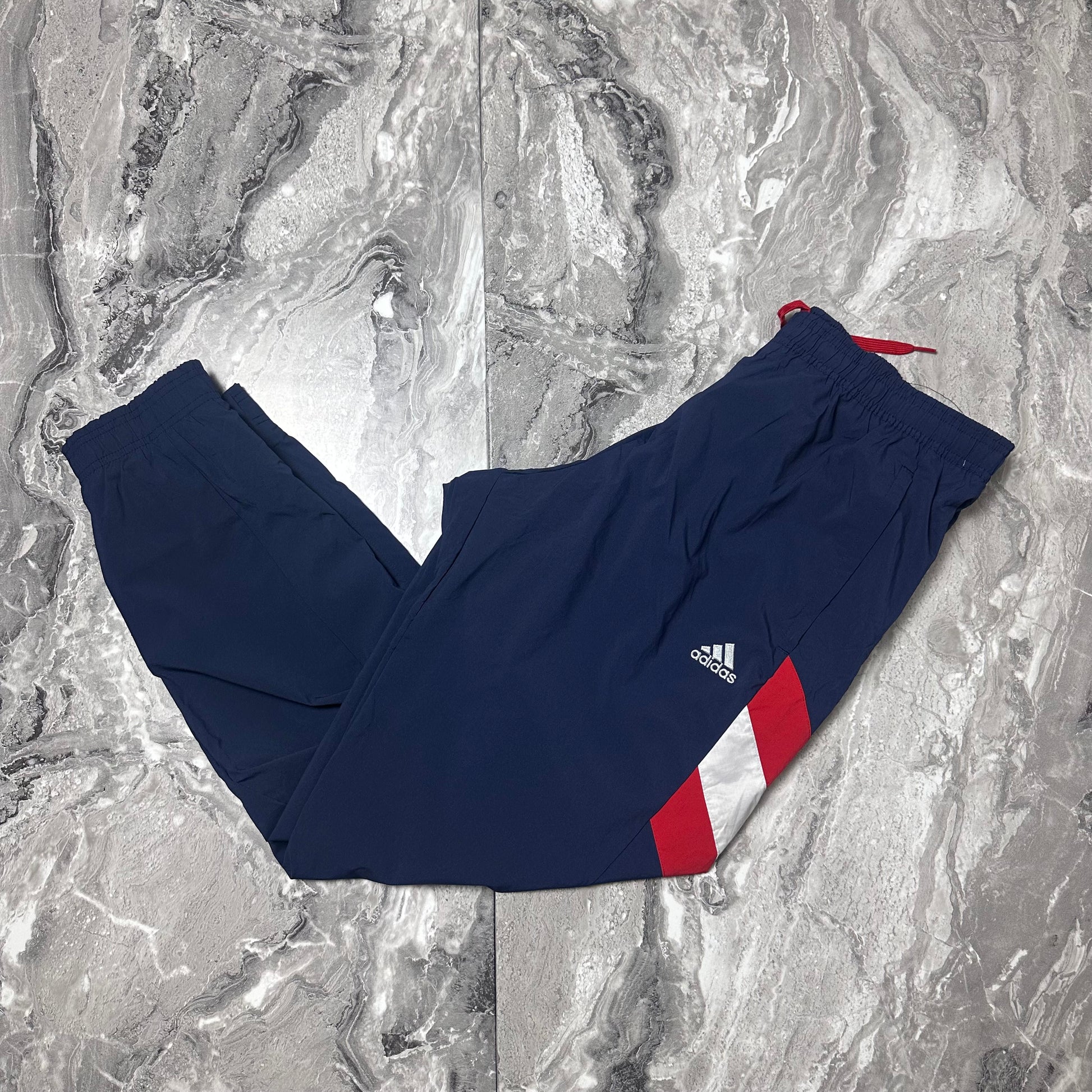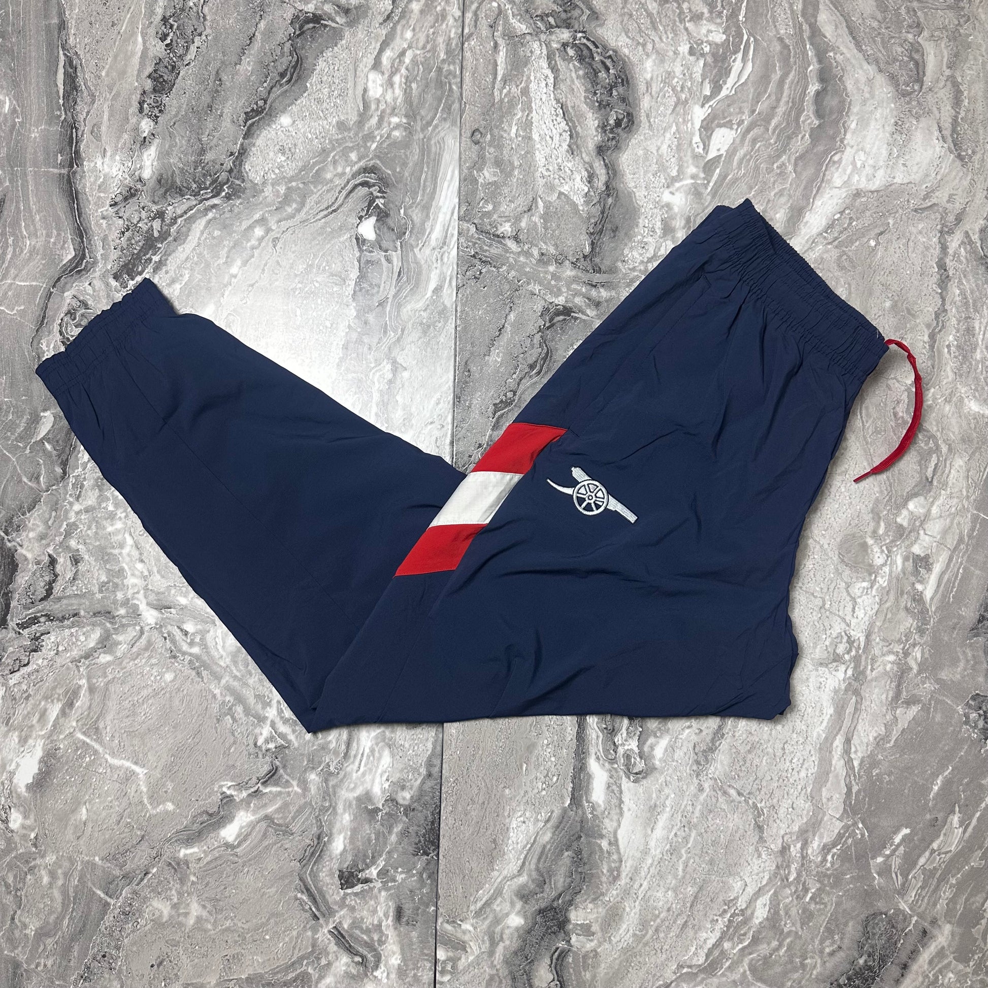 Track pant Adidas bleu marine avec logo brodé et empiècement rouge / blanc sur la jambe. Écusson Arsenal brodé, détail cordon rouge à la taille et bas zippé. Coupe typique training football.