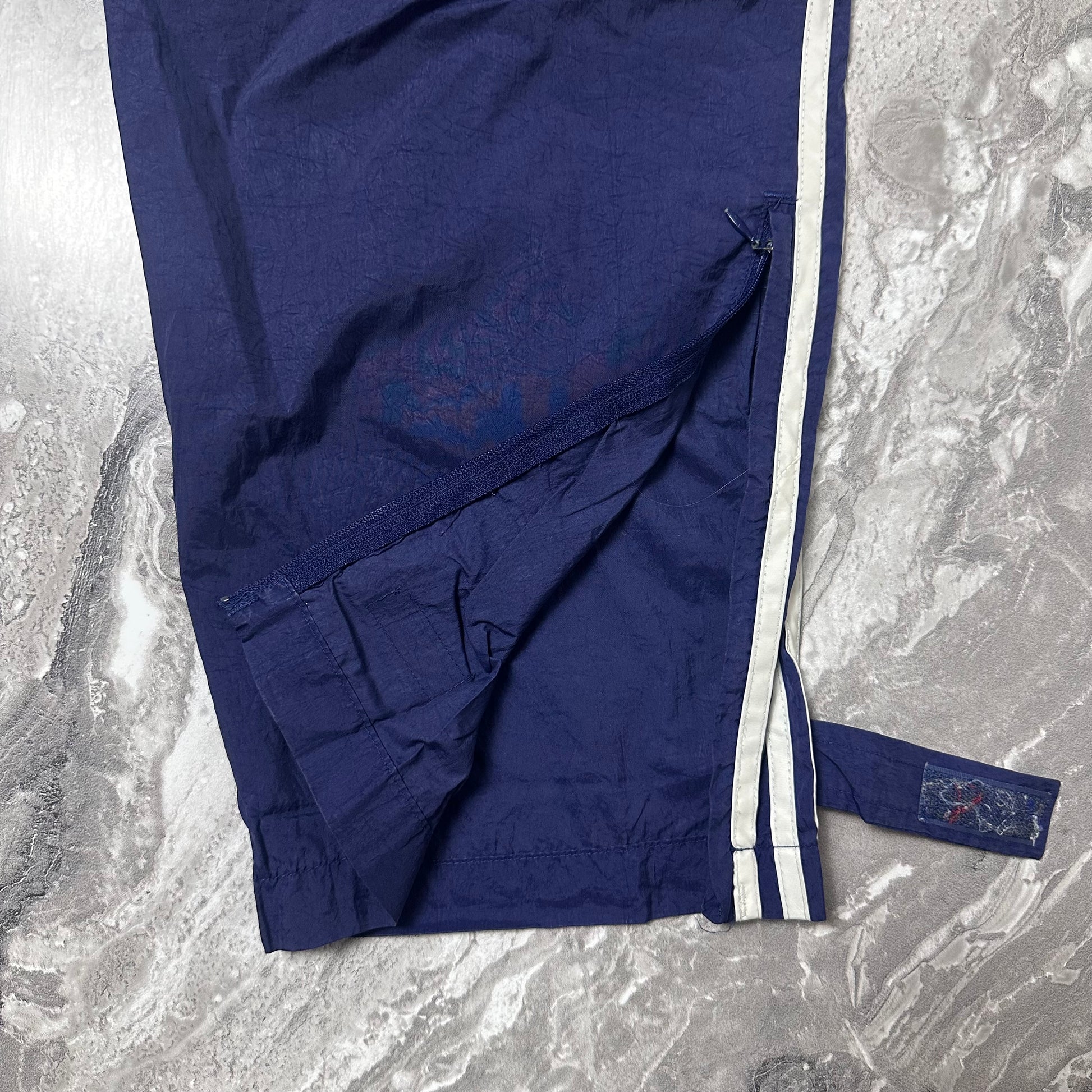 Track pant Adidas bleu marine avec logo brodé et bandes blanches latérales iconiques. Coupe ample typique fin 90s / début 2000s, taille élastique et style rétro sport bien marqué.