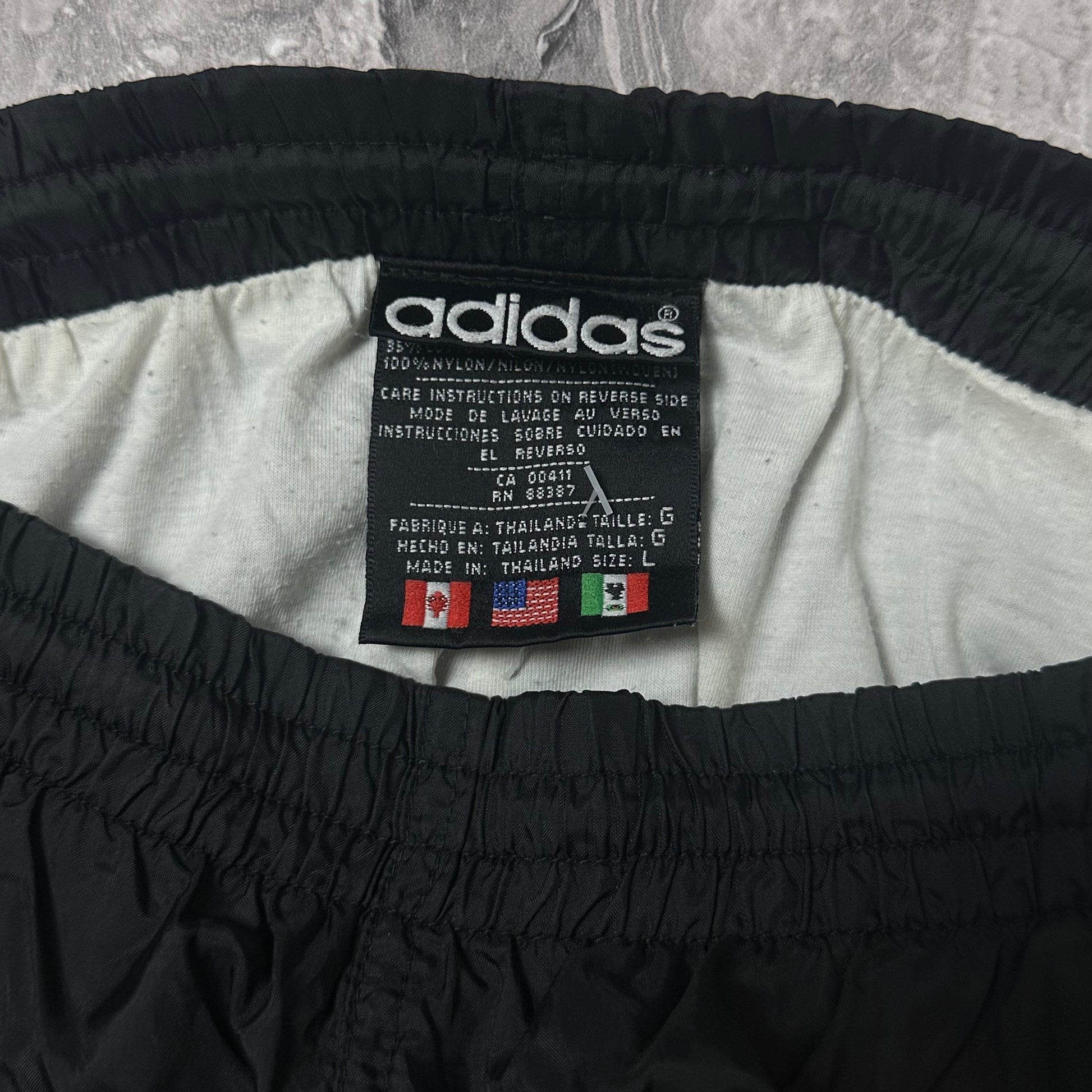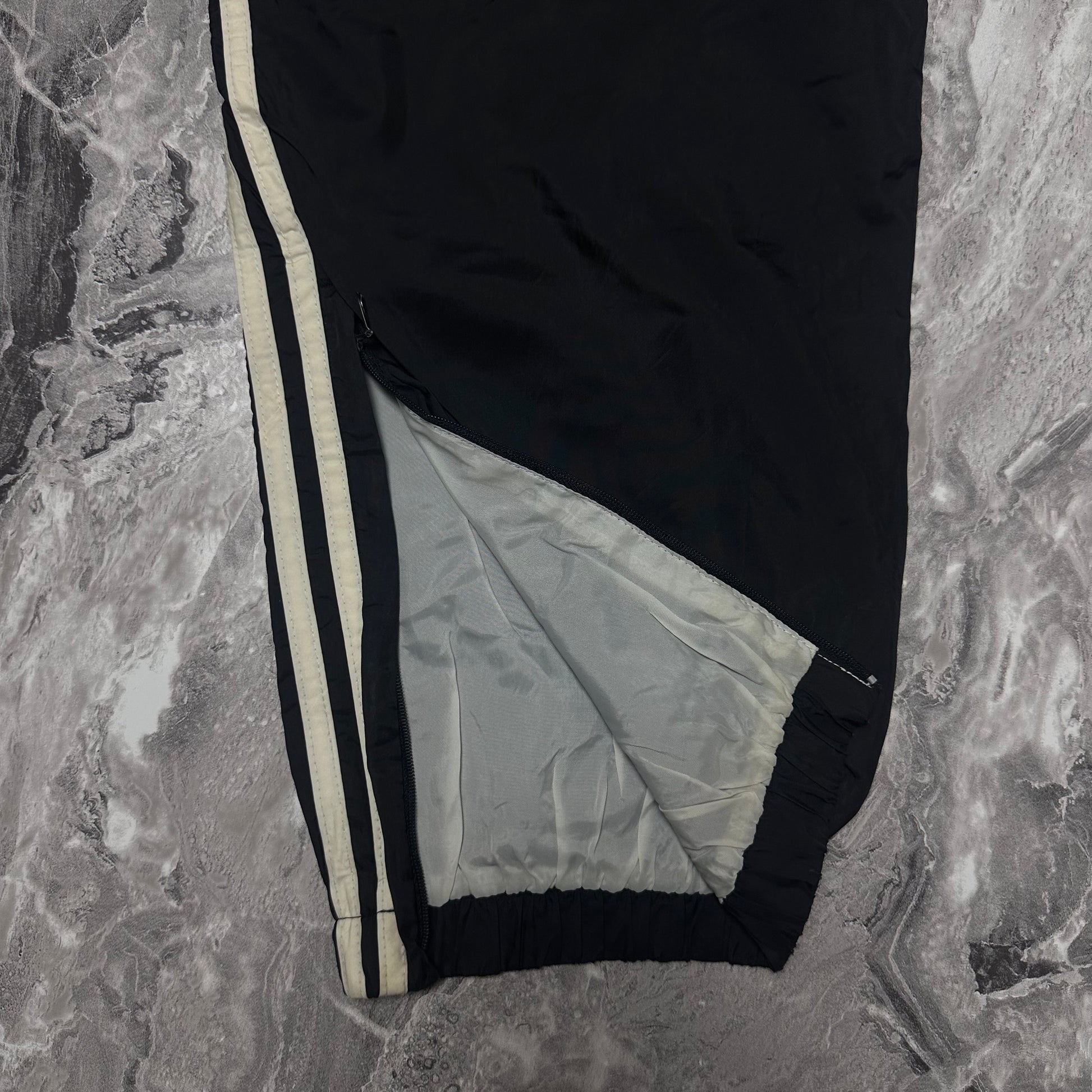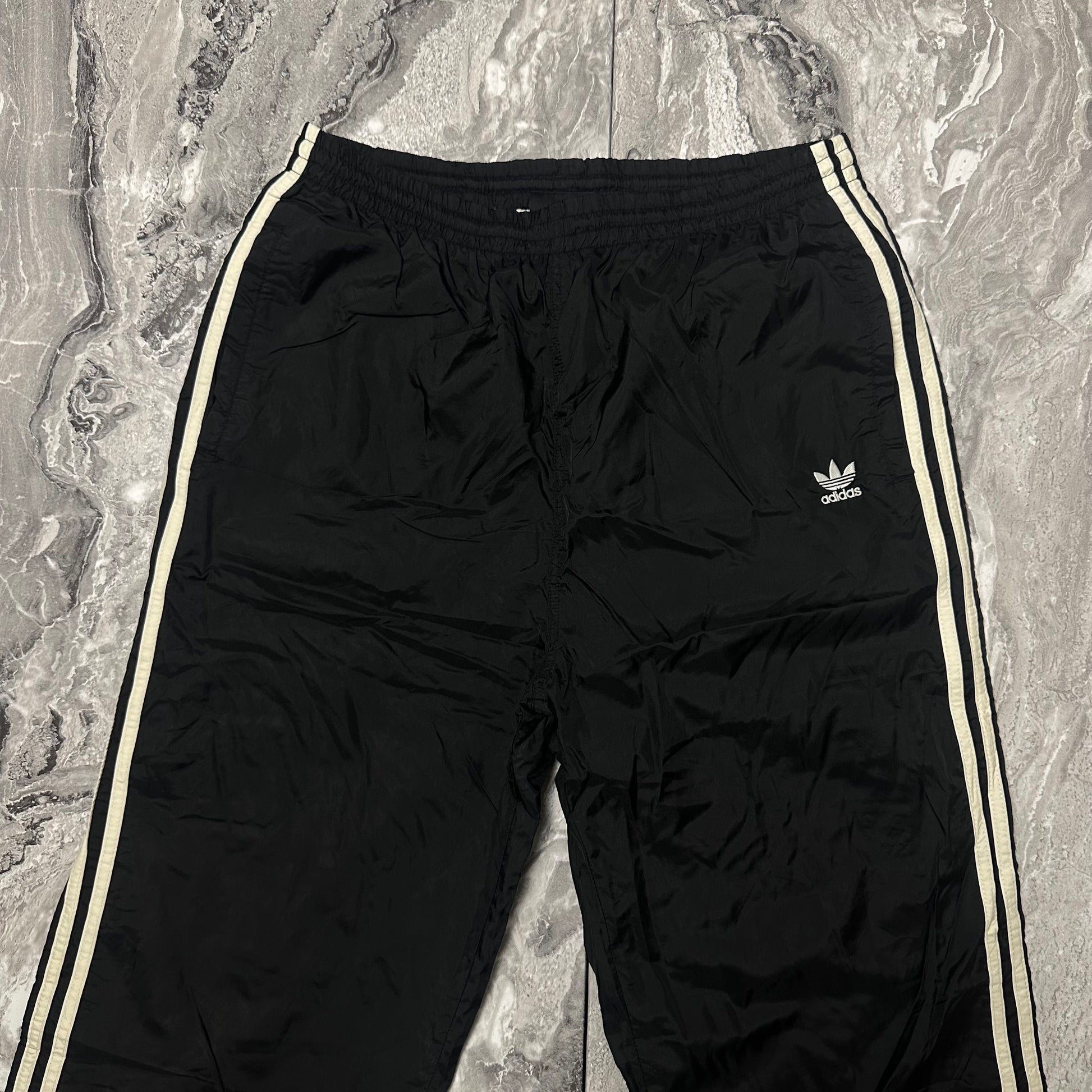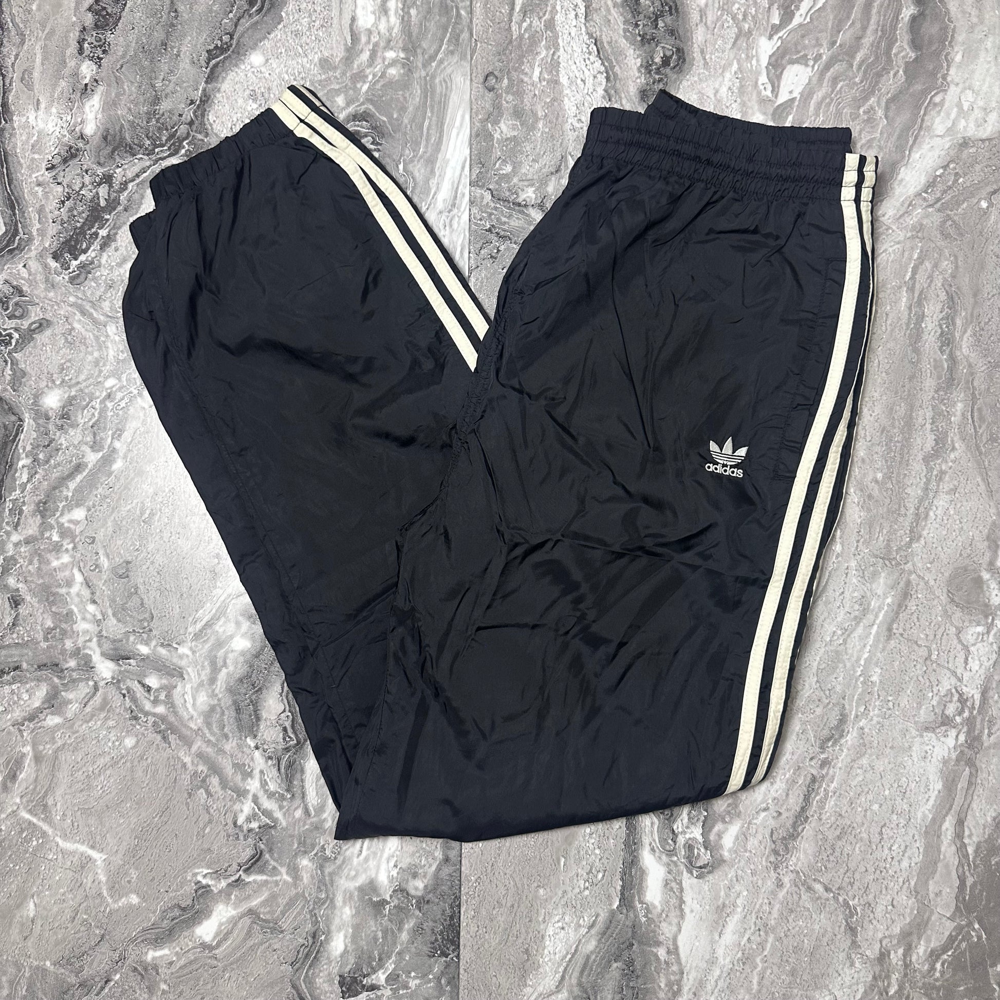 Track pant Adidas noir avec bandes blanches iconiques sur les côtés et logo brodé à l’avant. Coupe ample et confortable avec taille élastique pour un fit parfait au quotidien.
