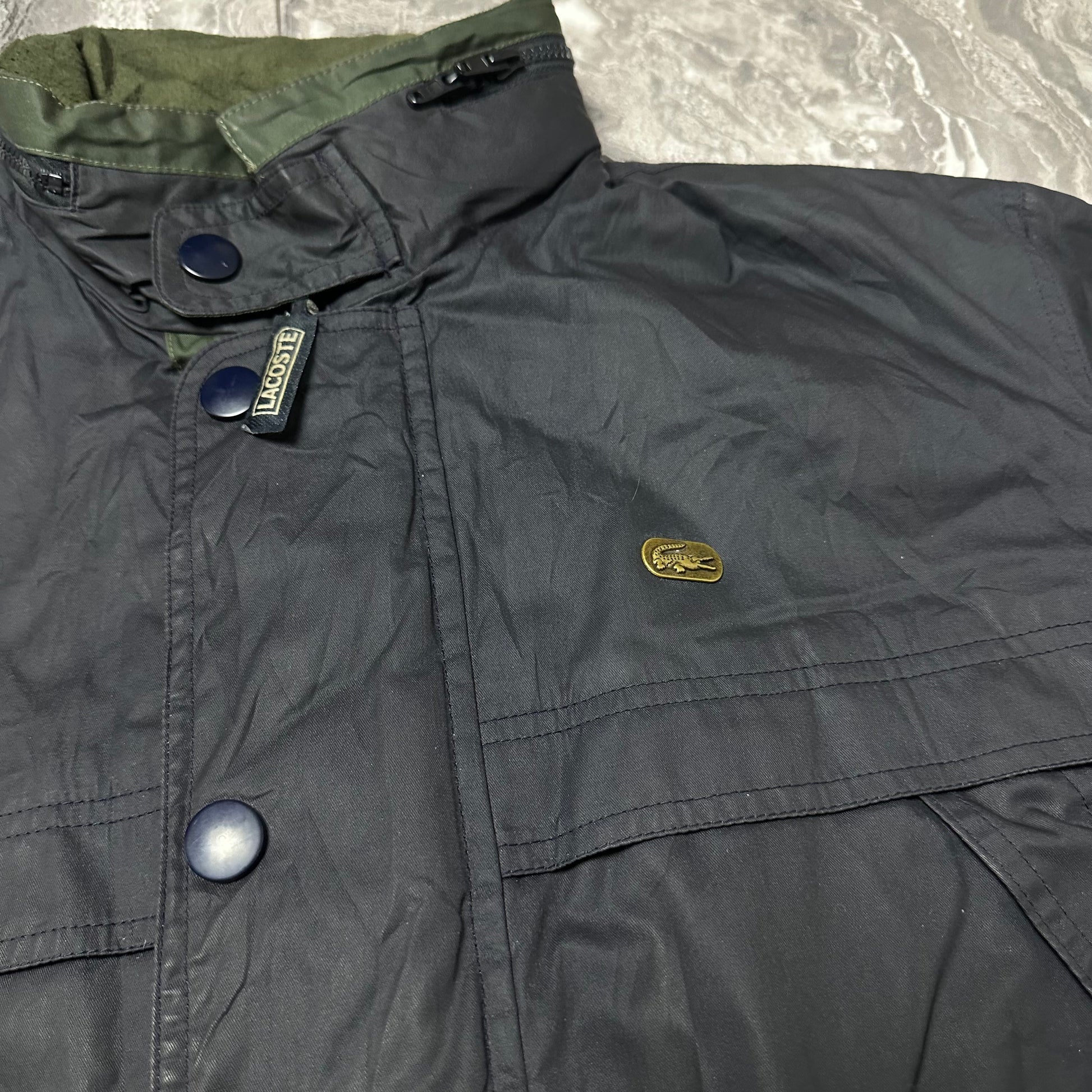 Cette veste Lacoste présente une coupe droite typique des années 90, avec col montant, fermeture zippée sous patte à pressions et multiples détails utilitaires. Le coloris sombre contrasté par des finitions vert olive lui donne une allure à la fois sportwear et légèrement outdoor. Le logo crocodile métallique sur la poitrine apporte une touche signature discrète. On note une usure brillante sur l’ensemble de la veste due à son ancienneté, ce qui renforce son aspect vintage et témoigne de son authenticité. L’intérieur doublé offre plus de confort, parfait pour la mi-saison ou les journées fraîches. Une vraie pièce seconde main avec du vécu, idéale pour un style rétro assumé.